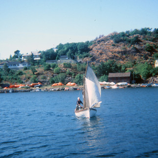 Manzanita's sail rig now consists of a Gunter rig mainsail, with the spar held almost vertical next to the mast. The mainsail is loose footed, but when running downwind we pole it out on an oar to prevent it from jibing all the time. The full cotton jib can be replaced by a smaller, heavier jib in strong winds.