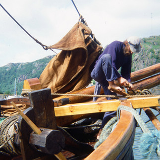 We are currently sitting in Tananger, the jumping off point for the next destinations of Egersund and Flekkefjord. After we left Dalland's shop, we rowed and sailed down through the cut and crossed Langemuin after dinner, rowing to windward into the Bomlo near Fitjar. We set the net and slept on shore while a mother oyster catcher bird scolded us all night. Next morning we pulled up the net which contained a three foot cod, among other things. Rowed and sailed south through the Bomlo and were able to sail downwind into Dafjord, where we visited a slipway in search of a jakt, which wasn't there. On down the way, we rowed through a narrow canal and reached south some more. Anchored between two islands to boil up fish and eat.